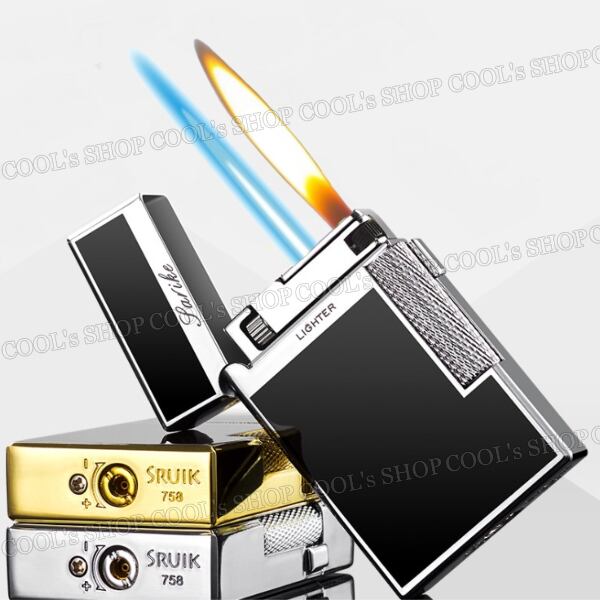 ターボ切り替え可能 フリントガスライター ローラー着火 シンプル ボタン切り替え かっこいい オシャレ ブラック×ゴールド ブラック×シルバー 黒 金 銀 送料無料